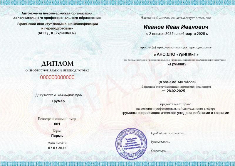 • Диплом о профессиональной переподготовке или сертификат о прохождении дополнительной образовательной программы «Грумер».