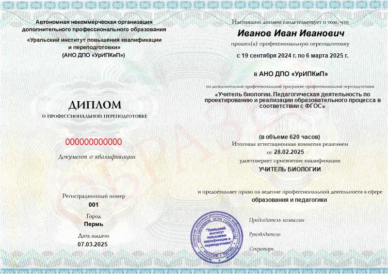 - Образец диплома о профессиональной переподготовке.